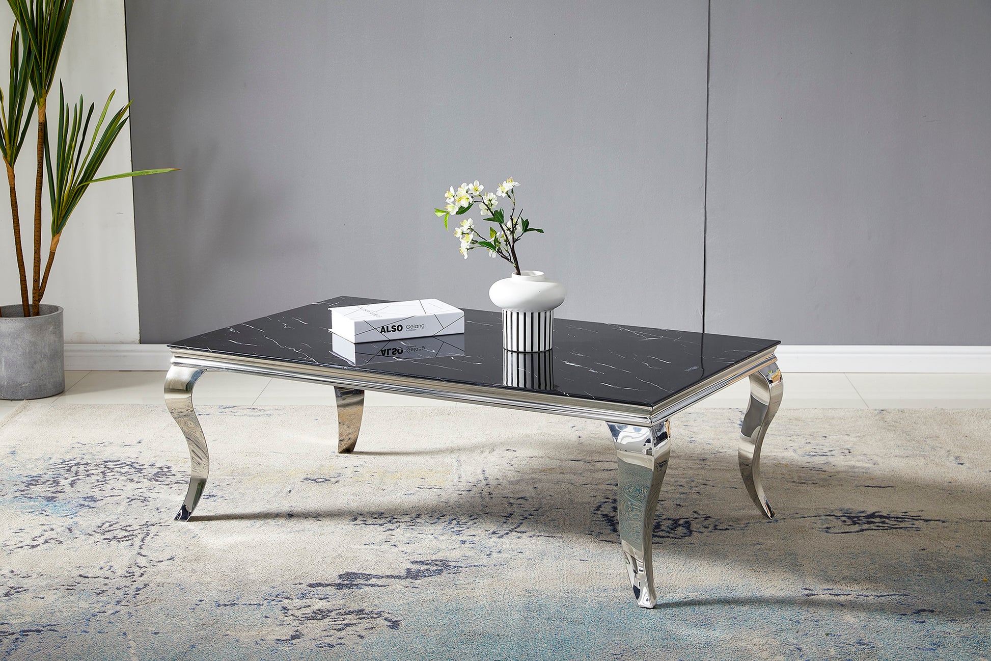 Apportez une touche de sophistication à votre salon avec cette table basse baroque rectangulaire. Dotée d'un élégant plateau en marbre blanc et de pieds en acier inoxydable argenté, elle combine durabilité et style raffiné. Disponible également en marbre beige, gris, ou noir, et avec des pieds argentés ou dorés, cette table est parfaite pour s'adapter à divers décors intérieurs.